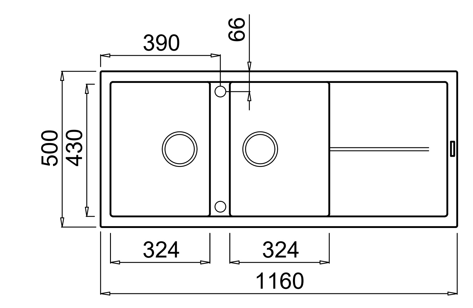 Integrovaná oblast pro příslušenství v odkapávači, vybavená předvrtanými otvory, které vám umožňují instalovat doplňky: excentrické ovládání odpadu, dřezovou baterii s vytahovací sprchou a dávkovač saponátu.